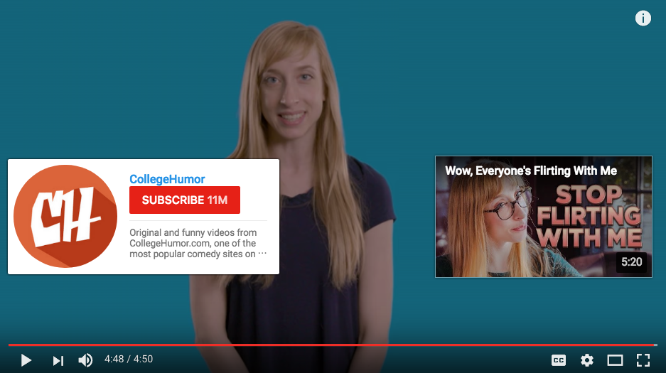 2. End-cards. An end-card works similarly to a card except that it appears at the end of a video and takes up the whole screen. For example, in the screenshot below you can see College Humor’s end-card featuring a large subscribe button. This button is clickable so it makes it easy for the viewer to click – and for CTR to rise.